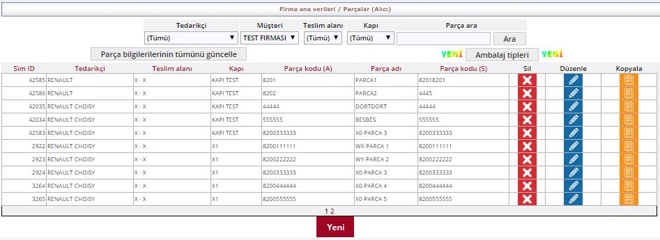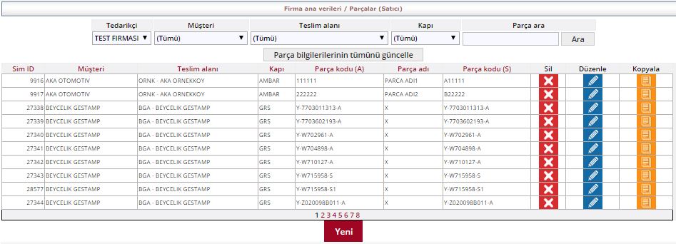 Parçalar alanı daha önce tanımlanmış parçaların görüntülenmesini sağlar. Sayfanın en üstünde yer alan Muhatap alanı, Teslim Alanı,