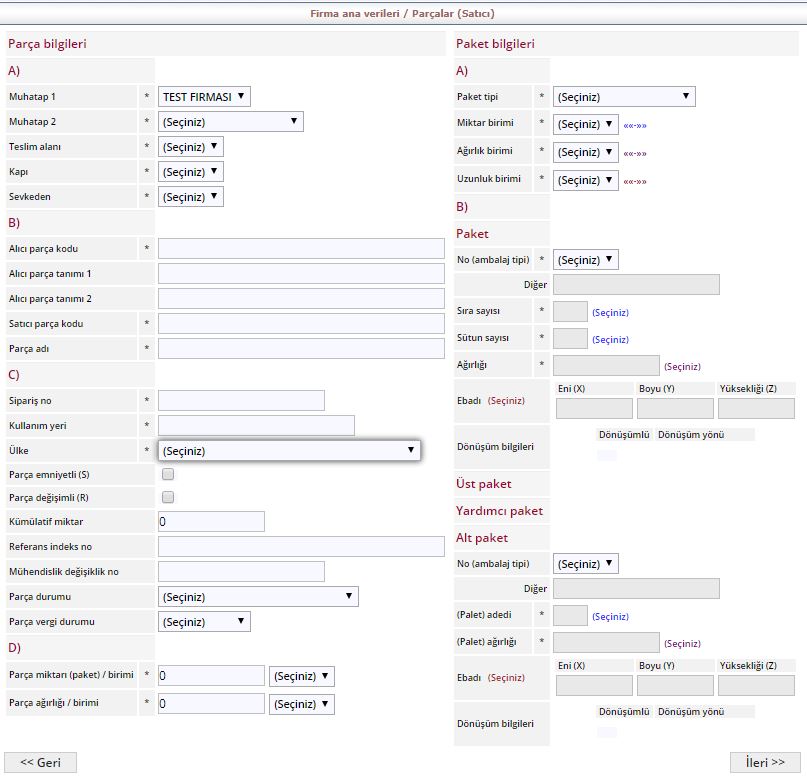 Yeri No ve Ülke girilmesi zorunlu alanlardır. Parça Bilgilerindeki Son alan parçaların fiyatlarının, miktarlarının, ağırlıklarının girildiği