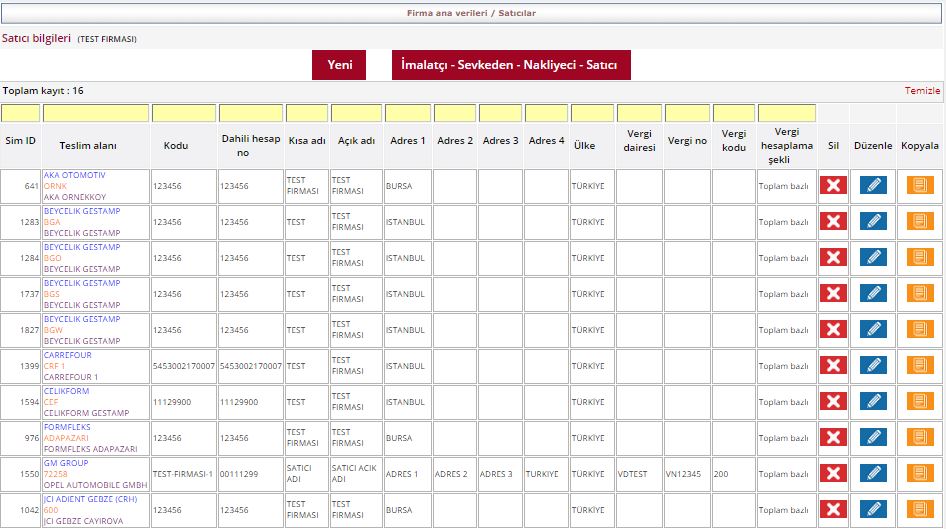 Satıcı firmaları listeler. Satıcı bilgilerinde değişiklik gerektiğinde ilgili satıcı firma karşısındaki Düzenle ikonu kullanılarak gelen