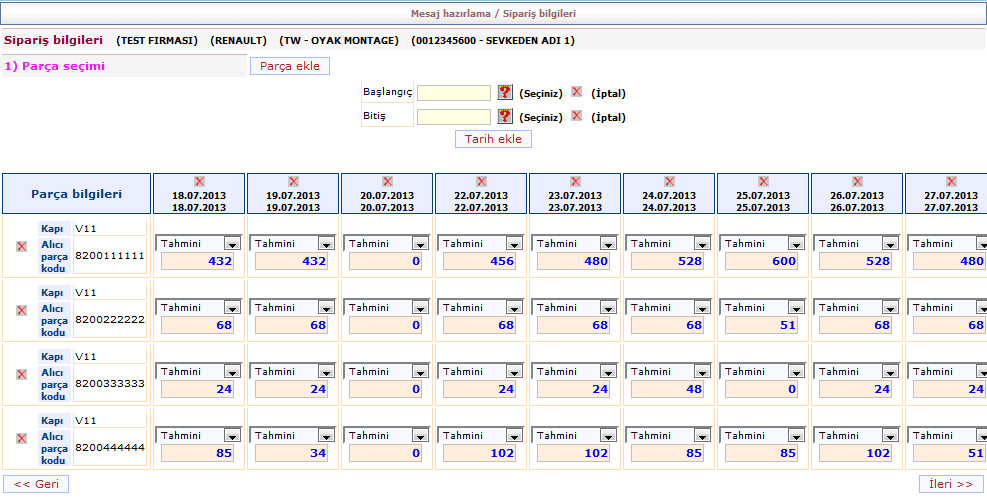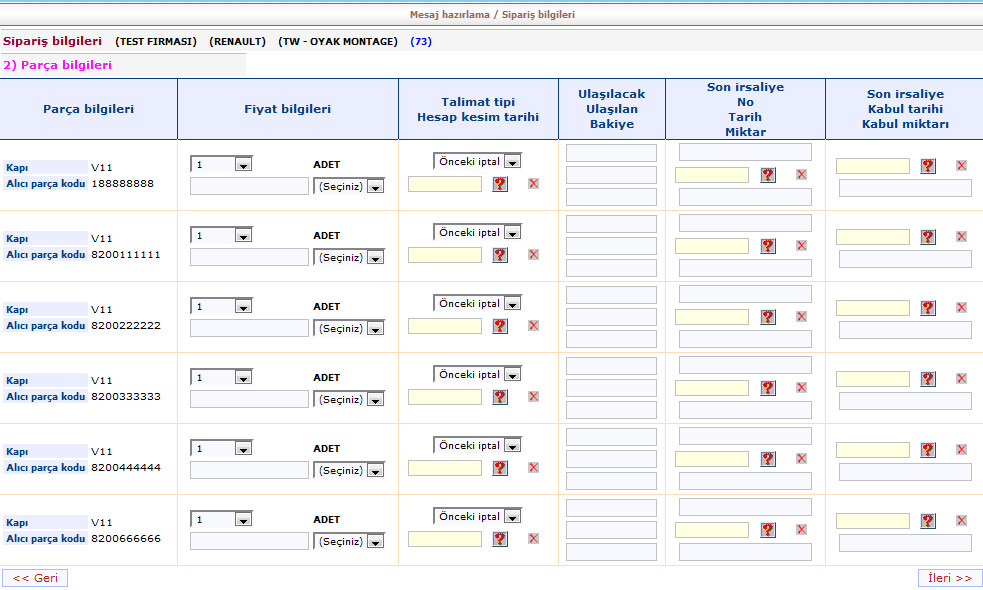 Parça detayı butonuna tıklayınca ekran aşağıdaki gibi olacaktır. parça fiyatlarını ve/veya adetlerini güncelleyebilirsiniz. Gerekli değişiklikleri yaptıktan sonra ileri butonuna tıklayınız.