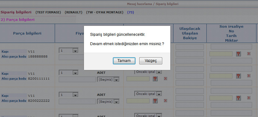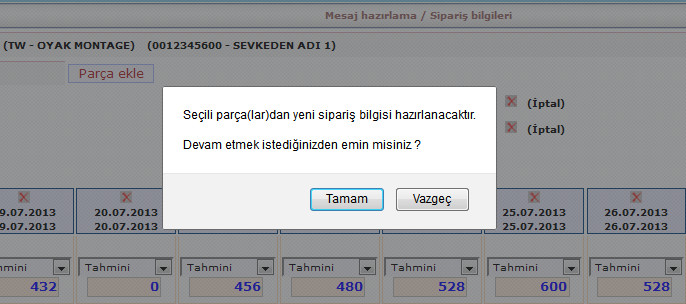 Parça detay ve sipariş girişi kolonlarında bulunan sarı butonlara tıklayarak işlemi devam ettirebilirsiniz.
