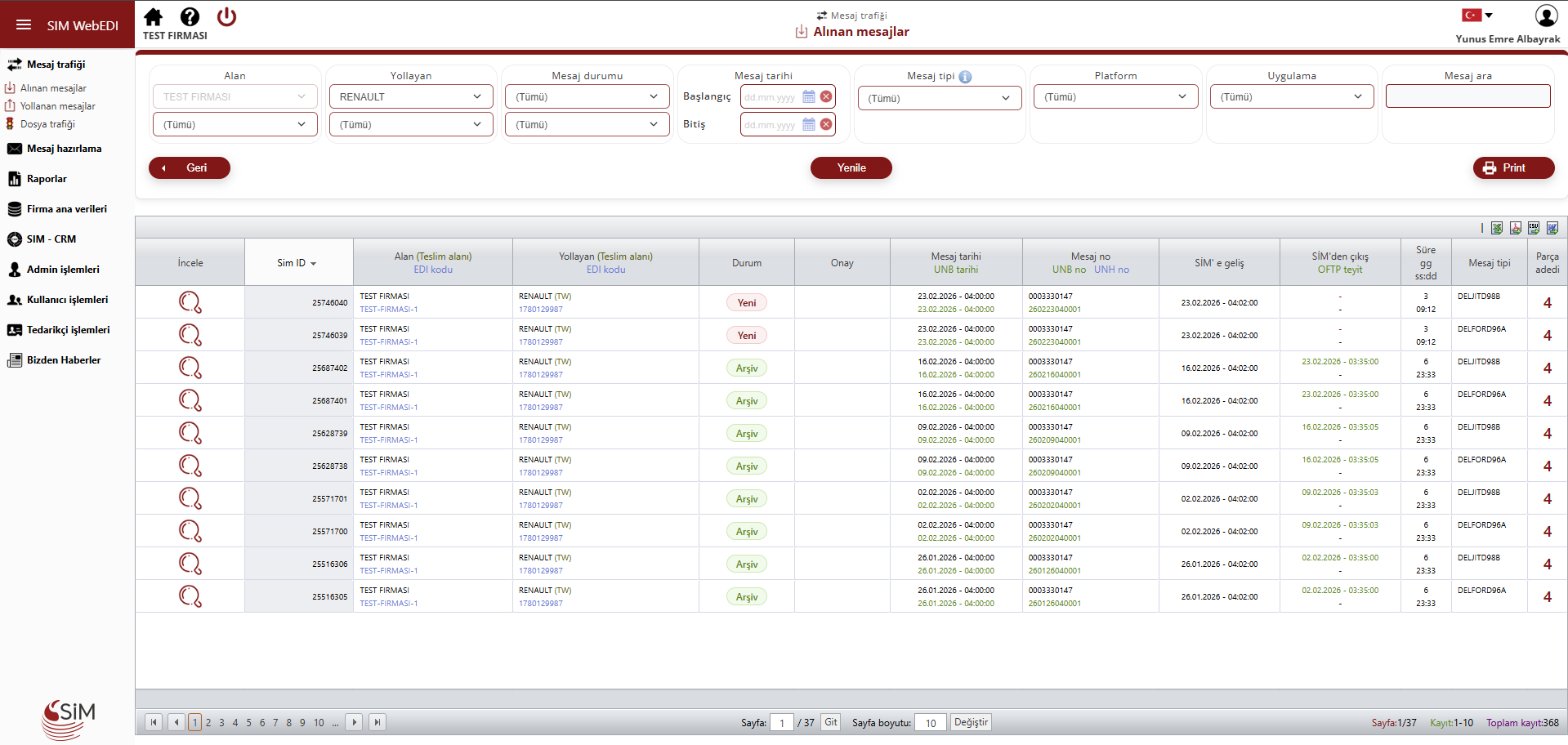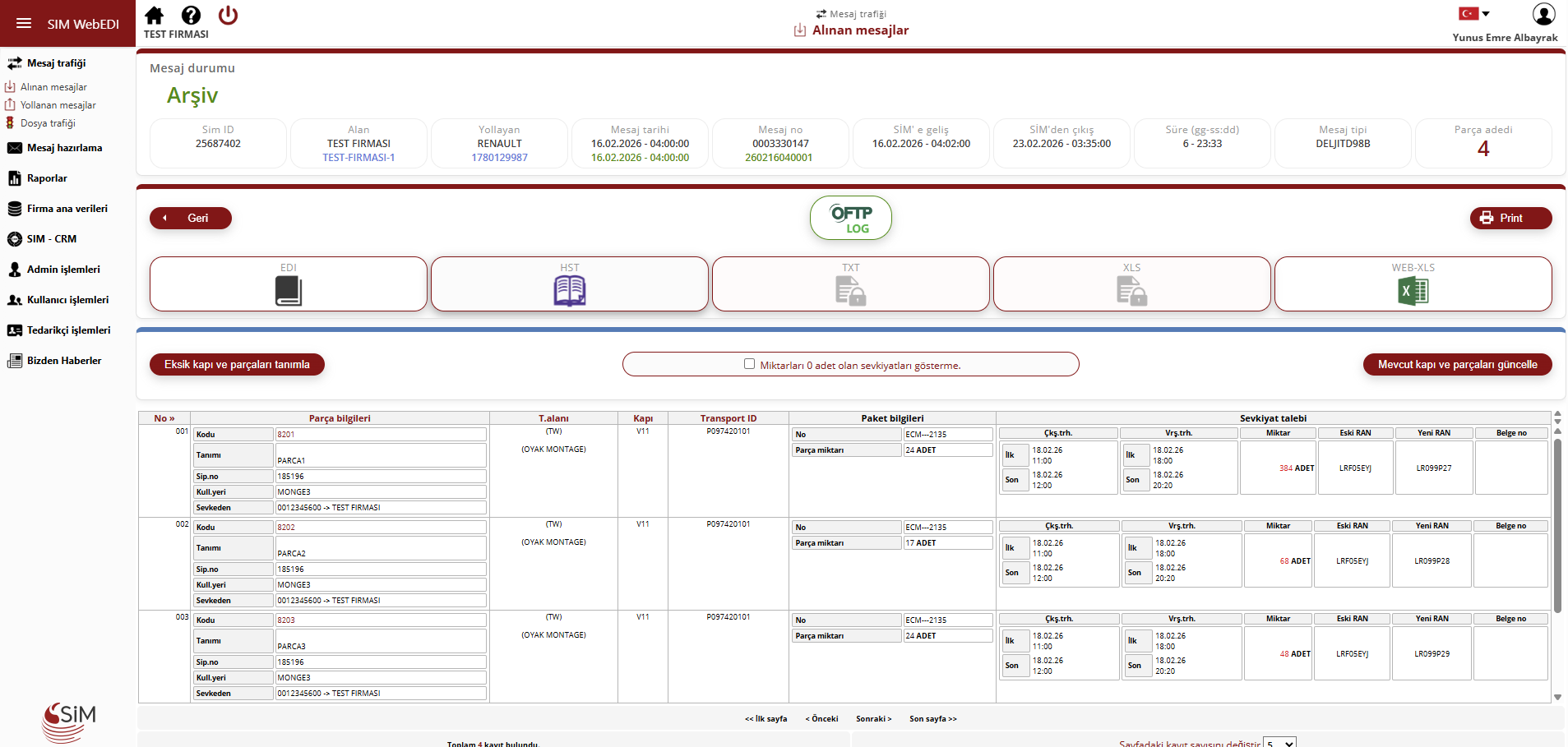 firmalardan FTP veya diğer dosya aktarım protokolleri kanallarıyla alınan her türlü mesaj SIM WEBEDI'ye
