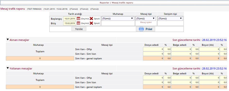 Firmaya ait trafik raporlarının görüntülendiği sayfadır. Tarih aralığı, muhatap, mesaj tipi, iletişim tipi-ni seçerek filtreleyerek farklı raporlar alınabilir.